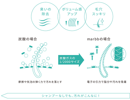 marbbが水と空気でつくり出すのは、髪の毛よりもはるかに小さく、電子の力で汚れを吸着して除去する効果を持つバブル。キューティクルの隙間や毛穴に入り込み、皮脂汚れや残留シャンプーを丁寧に除去します。